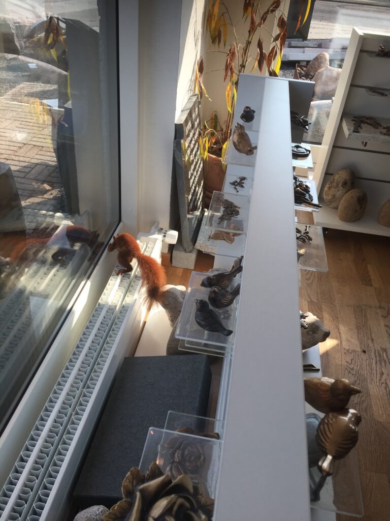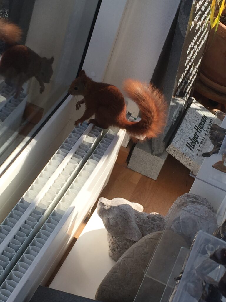Et noget forvirret egern var på springtur og var endte på vores kontor, den lille ven løb noget forvirret rundt, hvor efter den fik øje på vores granit egern som den satte sig ved og begyndte at studere.