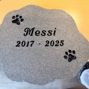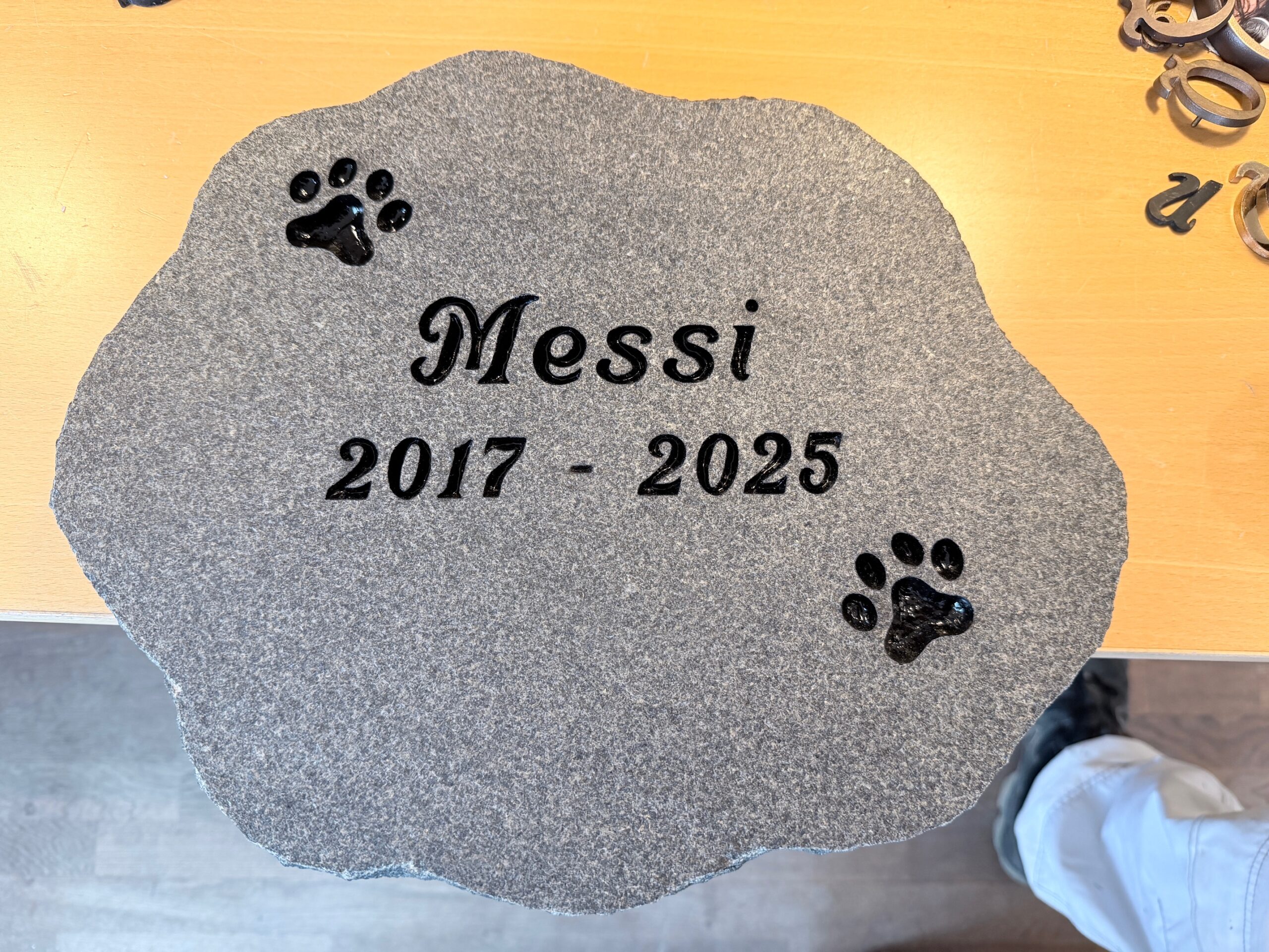Stenen er formet naturligt og med en brændt ru overflade, så den bevarer sit rå, organiske udtryk. Inskriptionen “Messi 2017 – 2025” er dybt indgraveret og omhyggeligt sortmalet 2 gange, så teksten står skarpt og tydeligt – også med tiden når malingen forsvinder. For at give mindestenen et ekstra personligt præg tilføjede vi to poteaftryk.