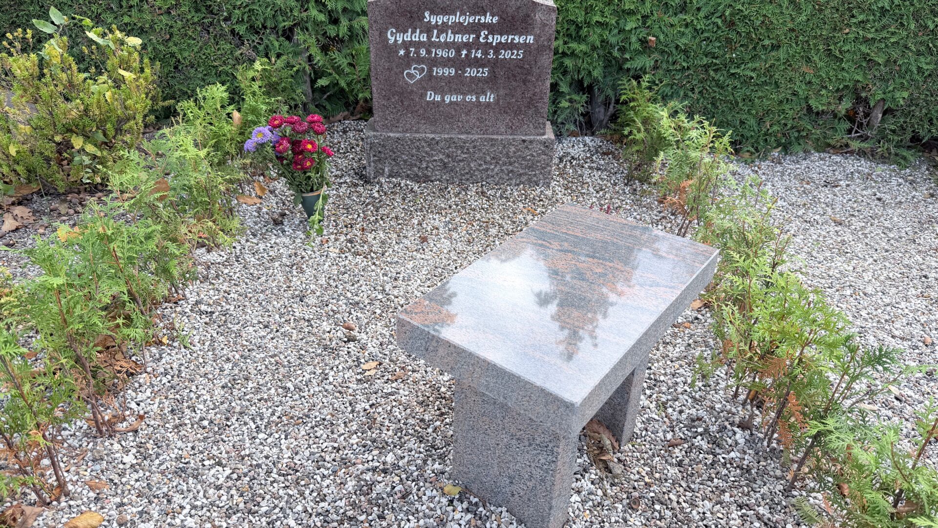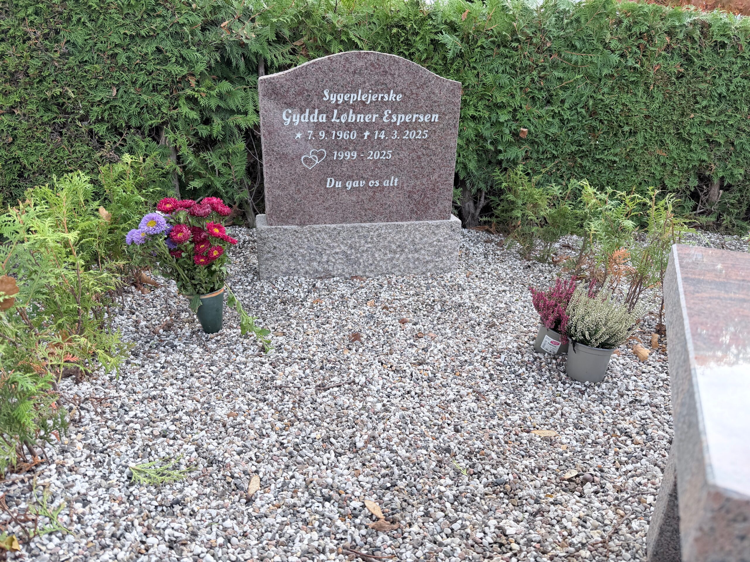 Derudover ønskede ægtemanden også at mindes deres fælles historie: Årstallene 1999–2025, perioden de to var gift. Ud for årstallene er indgraveret to sammenhængende hjerter – et enkelt, men stærkt symbol på livslang kærlighed. Nederst fuldendes stenen med efterskriften: “Du gav os alt.”