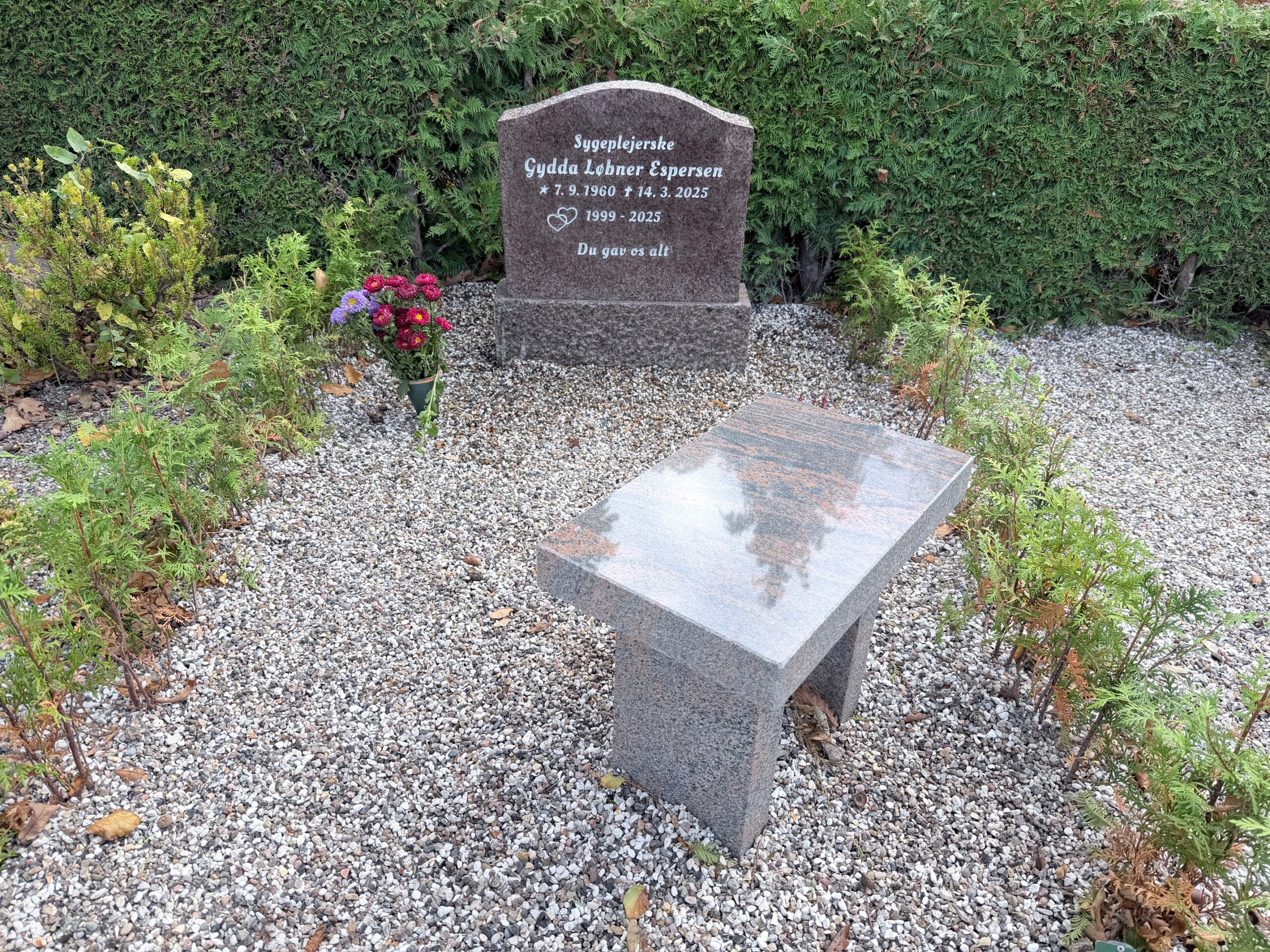 Som en ekstra og meget personlig detalje fik vi også lov til at skabe en lille bænk på gravstedet. Den er udført i Halmstad poleret granit, 50×30 cm i en ren, rektangulær form. Kanterne er brændte, og bænken står på to brændte (ru) ben, som giver den et naturligt og harmonisk udtryk i samspil med omgivelserne.