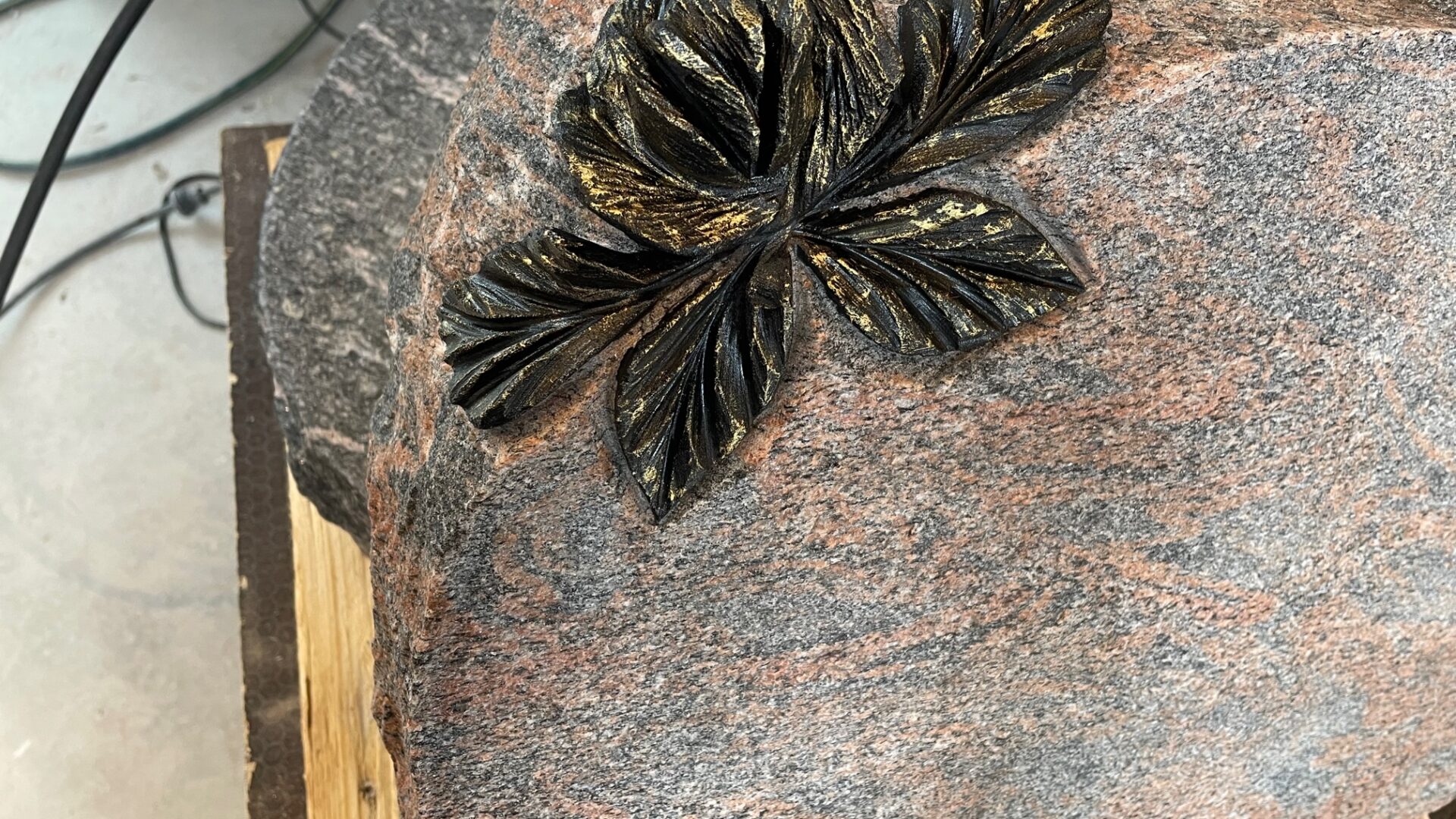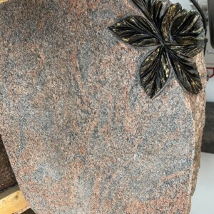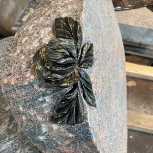 En Halmstad granit som er brændt (ru) i overfladen, med ru tilhuggede kanter, dekorationen er en rose skåret og hugget ud af stenen, det er i et stykke, den er ikke limet på eller eftermonteret.