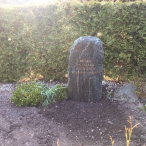 Gravstenen er en grøn Spalt sten hvor vi har monteret inskriptionen i bronce.