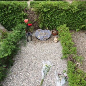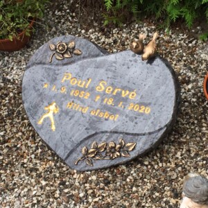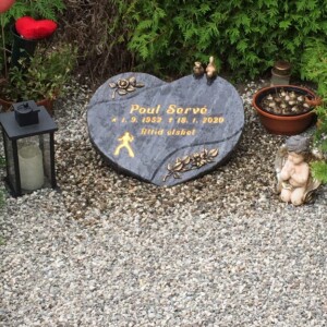 Gravstenen er en Orion granit, som poleret, den er hugget til i hjerteform og har ru tilhuggede kanter.