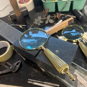 Virksomheden har selv fundet de her forstørrelsesglas som de gerne ville bruge, så vi har lavet en sort mat pol. sokkel, sat en tap i forstørrelsesglasset derefter boret et hul i soklen og limet det sammen.