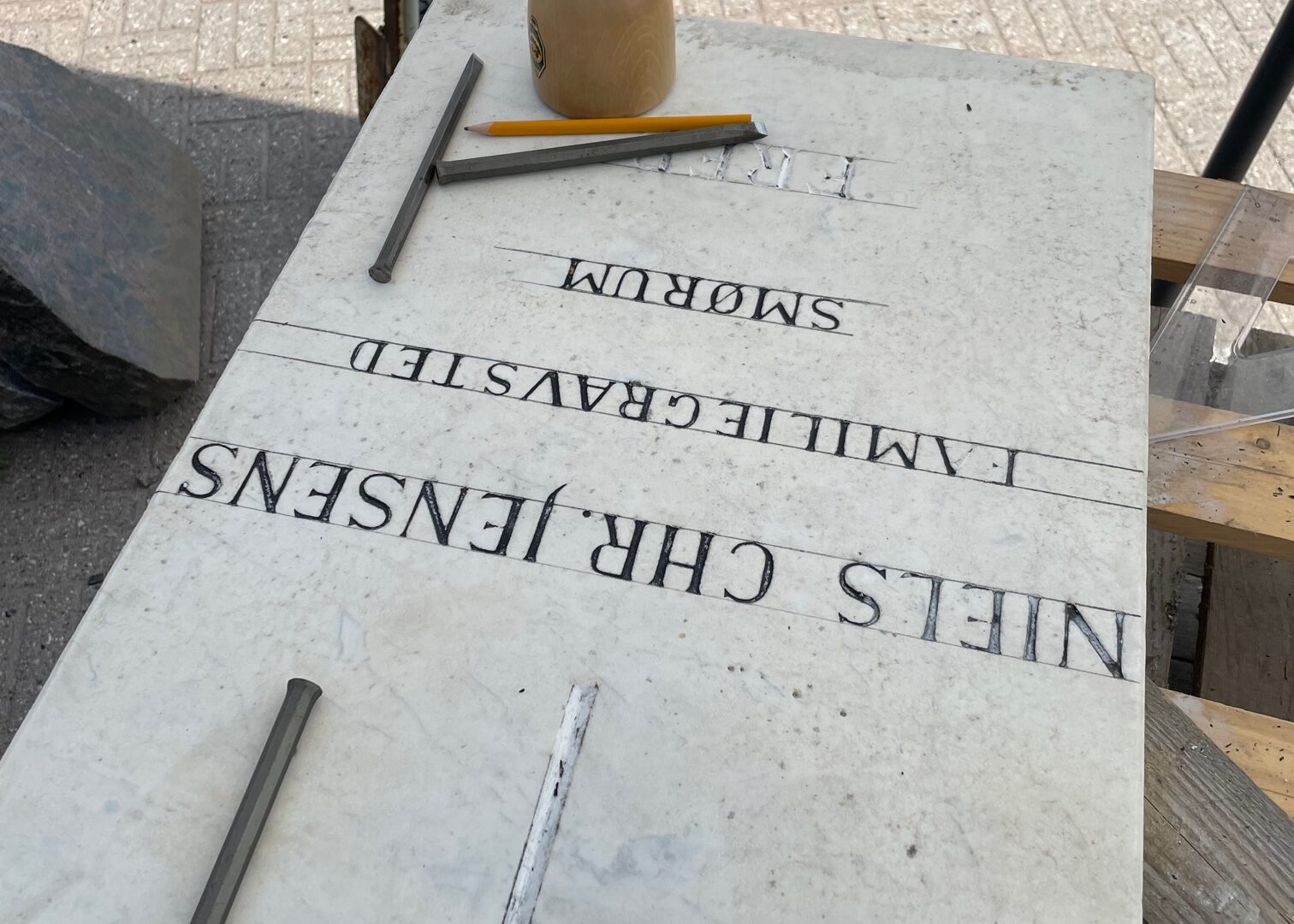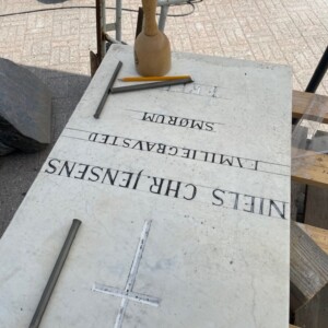 Her er det en gammel marmortavle som vi har hjemtaget, renset og slebet på fladen, efterfølgende tegner man alle linjerne på, tegner bogstaver og tal efter, og så hugger man det op igen.