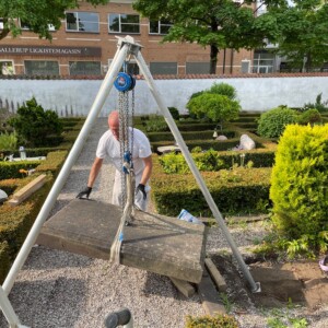 Vi har hentet gravstenen hjem, og sendt den til et sten-skæreri som har skåret gravstenen igennem under profilen som løb rundt langs kanten.