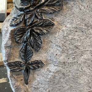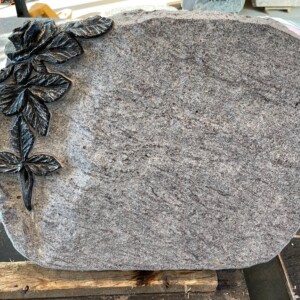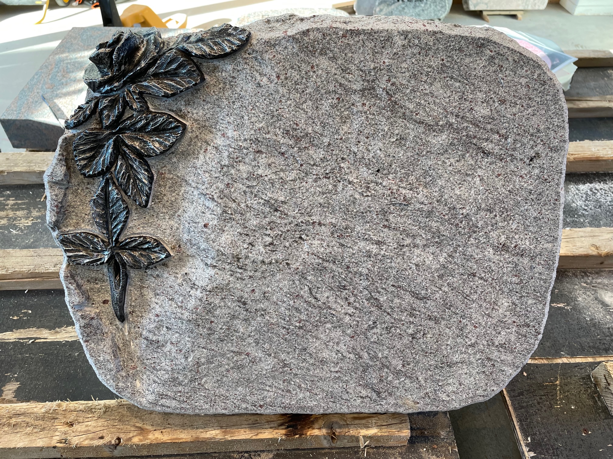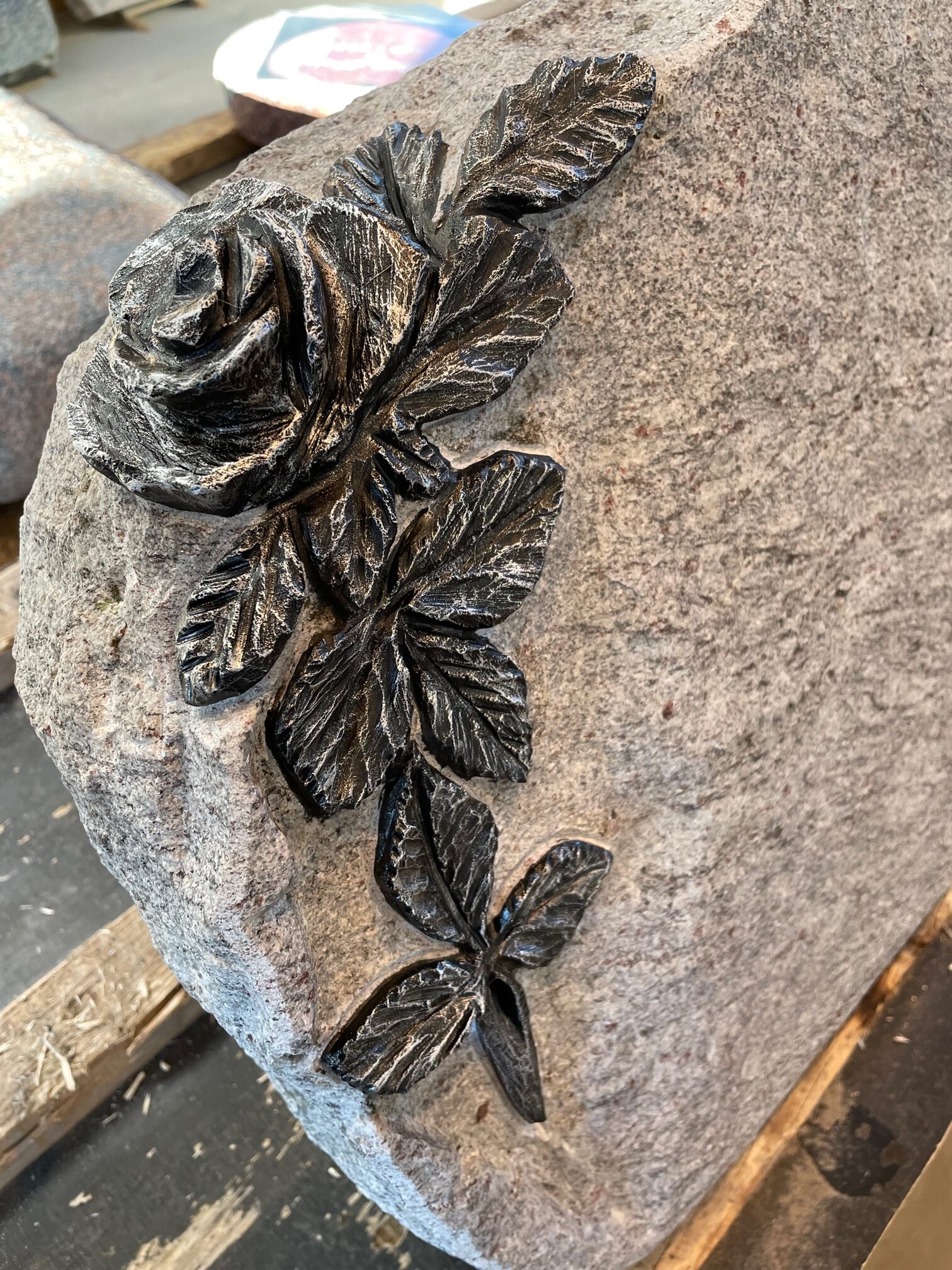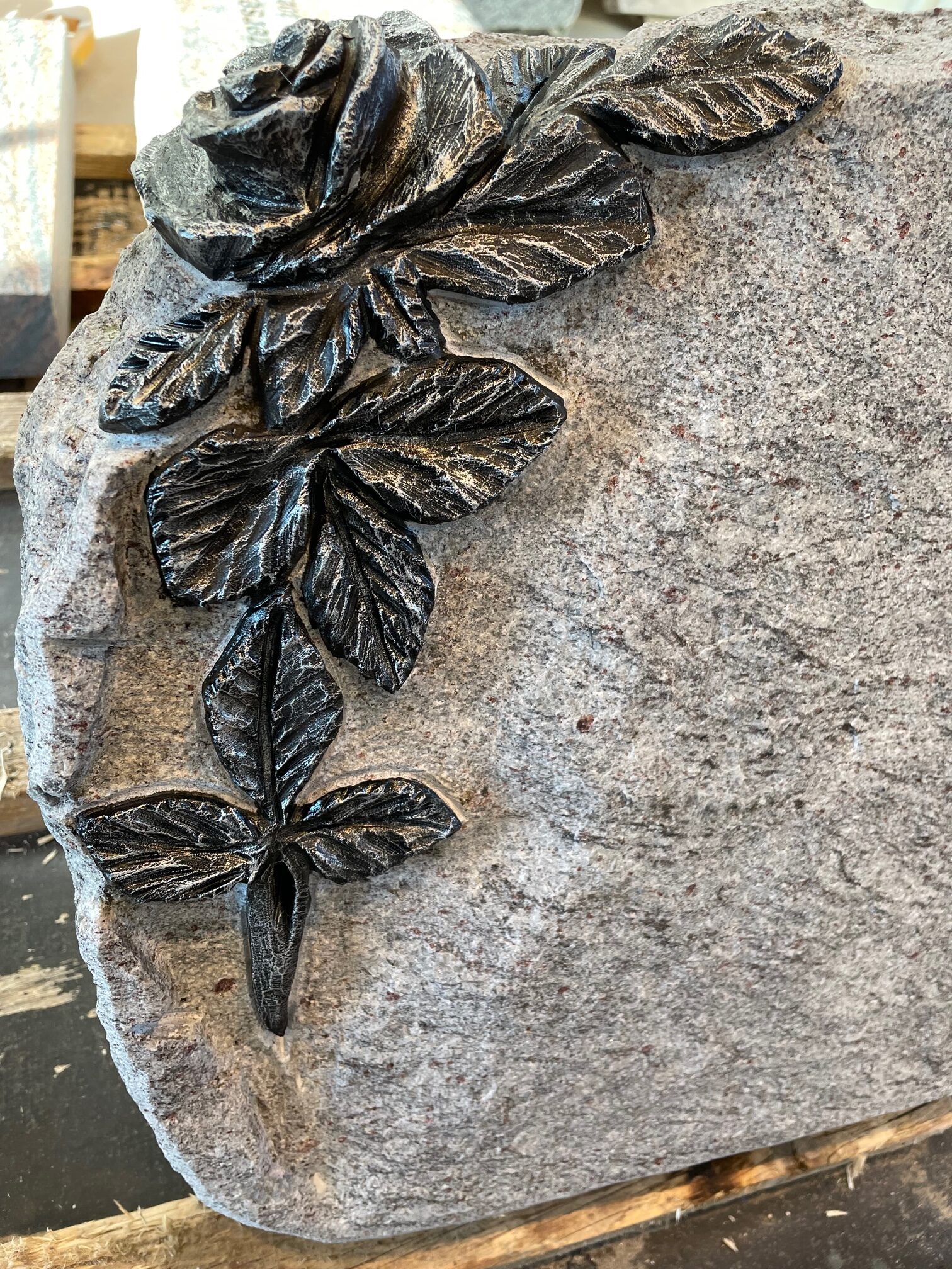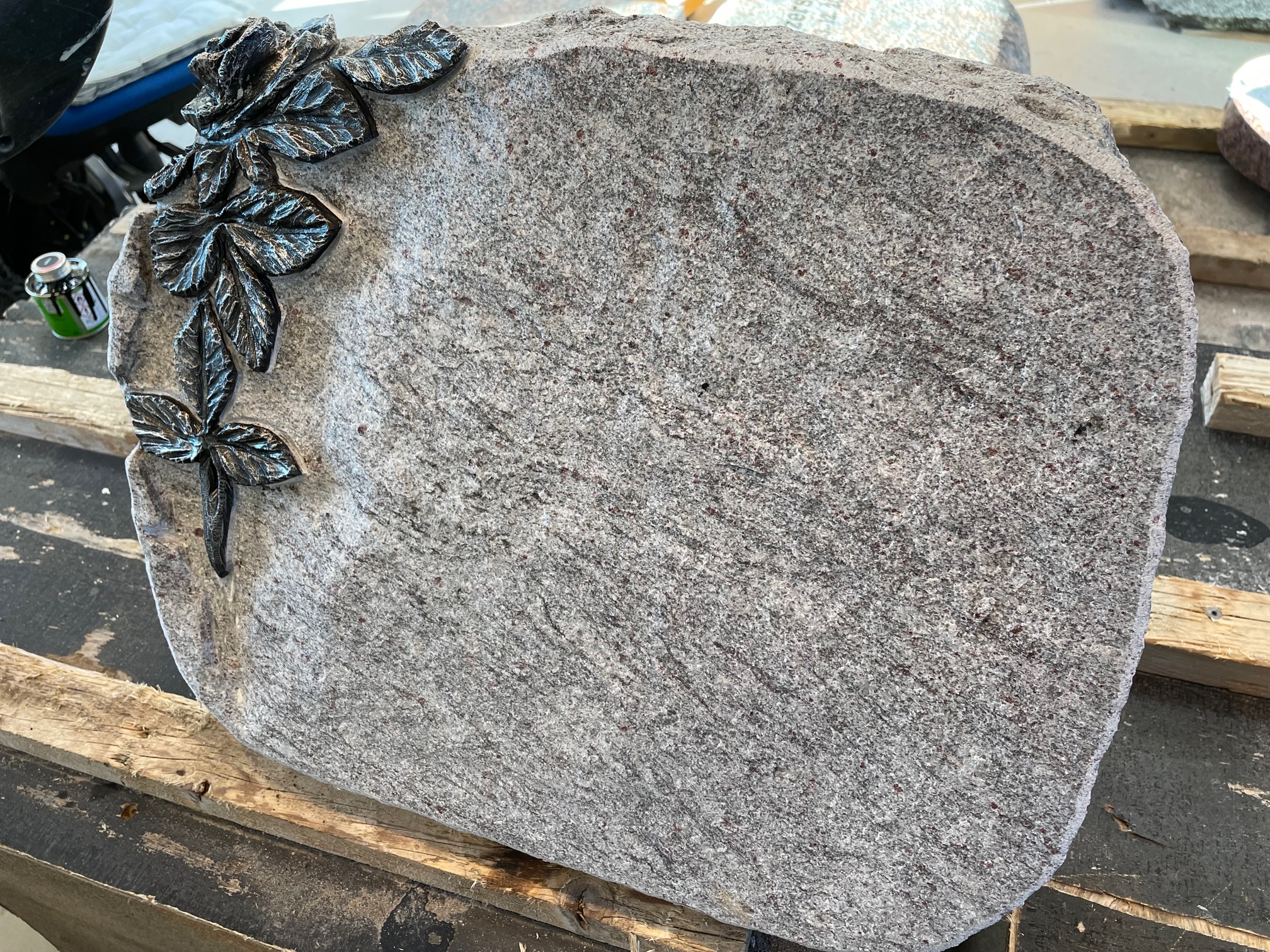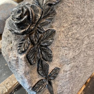 I året der gik lavede vi denne fine Orion gravsten, gravstenen er brændt (ru) på fladen, kanterne er ru tilsatte, rosen er så skåret ud, grundet med sort maling og efterfølgende patineret med sølv maling