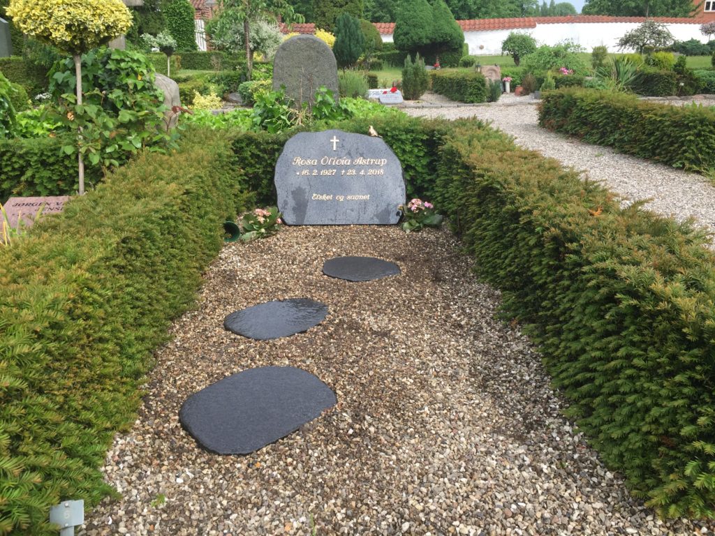 Afdødes datter er kunstner og meget kreativ, og derfor var det mig naturligt at inddrage hende i arbejdet med trædestenene, Lene har derfor designet størrelse og formen på de tre trædesten som pryder gravstedet, jeg har kun hugget dem til efter skabeloner.